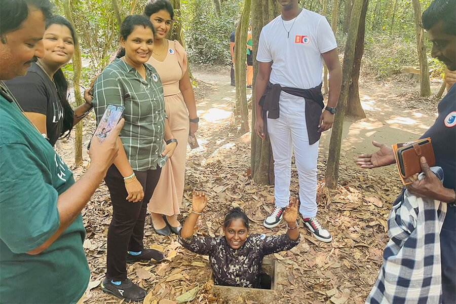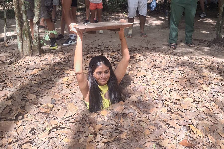In the morning, you will be picked up from your hotel at 8:00 AM for a scenic drive through the countryside to the Cu Chi Tunnels, located 50 km from the city center. This vast underground network played a vital role during the American War and remains one of Vietnam’s must-visit historical sites. Begin with an introductory video to understand its history before venturing into the narrow passageways, hidden trapdoors, and underground living areas.