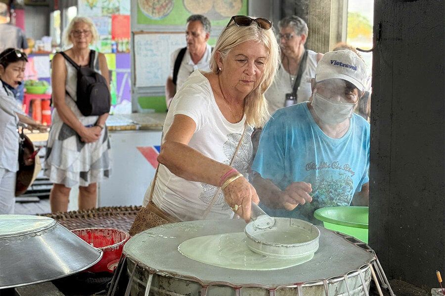 Today, we will drive to the Mekong Delta and take the boat ride on small canals to visit some local cottage industries, fruit orchards, a coconut candy workshop, a honeybee farm, take a sampan ride on palm-shaded creeks, try a taste of seasonal fruit, honey tea, and enjoy a performance of traditional Southern singing. Later of the day, we return to Ho Chi Minh City for overnight stay.