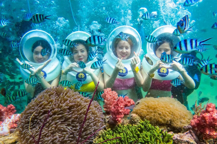 08:15 - 08:30: Pick up at hotel lobby Go straight to An Thoi Harbor and get on sharing speedboat to visit 3 islands: + Buom Island: Swimming and snorkeling + Gam Ghi Island: snorkeling at coral reef + May Rut Island: Take photos, Fly Cam Camera, SUP, best place to chillout Having lunch on islands Sea walker (self-sufficient): walk into the ocean to see the colorful fishes and coral reefs.
