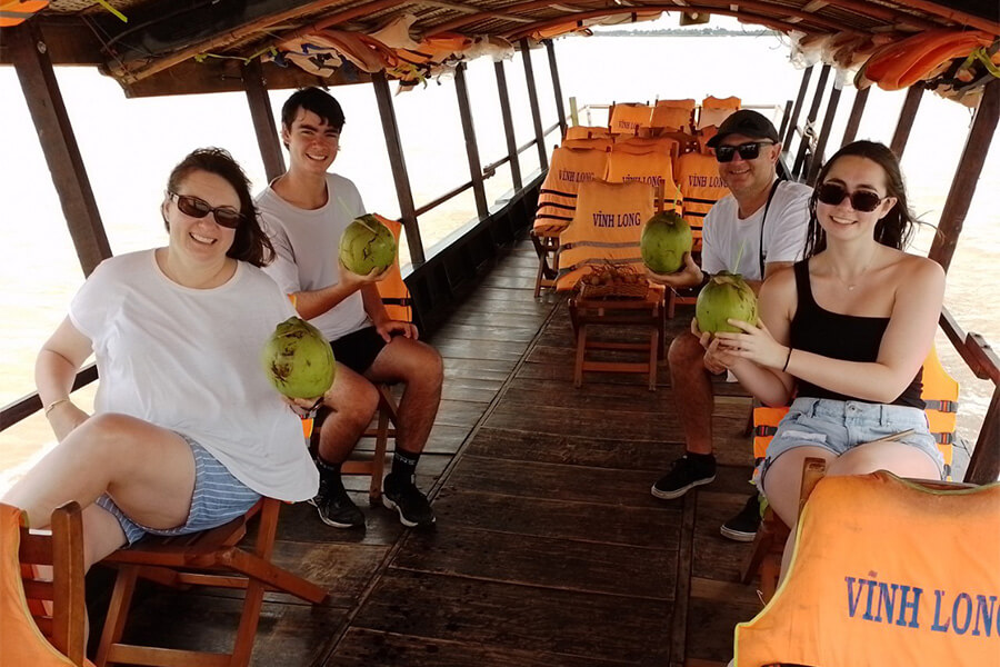 Today, we will drive to the Mekong Delta and take the boat ride on small canals to visit some local cottage industries, fruit orchards, a coconut candy workshop, a honeybee farm, take a sampan ride on palm-shaded creeks, try a taste of seasonal fruit, honey tea, and enjoy a performance of traditional Southern singing.